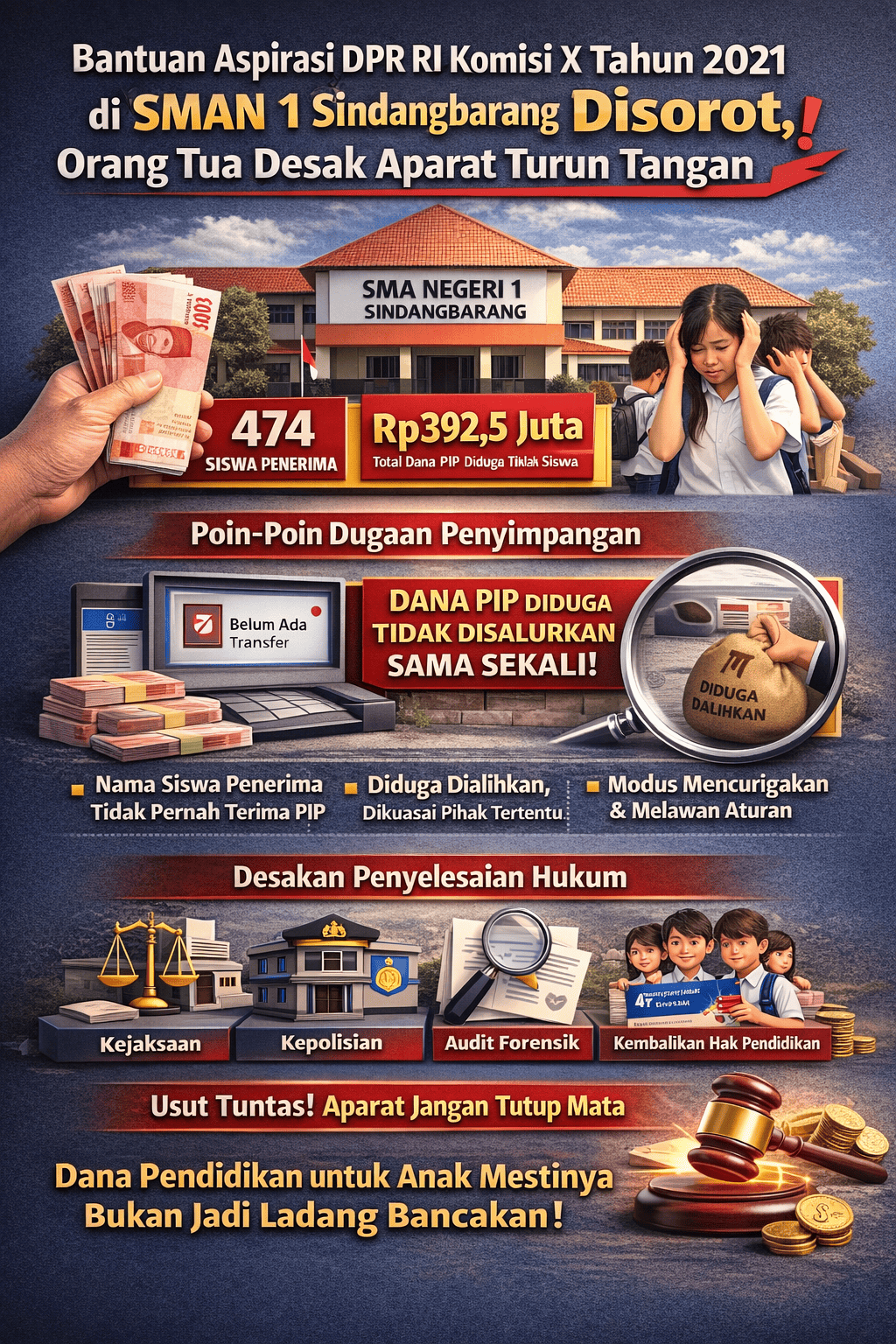 Atas dugaan tersebut, para orang tua siswa mendesak Dinas Pendidikan Provinsi Jawa Barat, Inspektorat, serta Aparat Penegak Hukum (APH) untuk segera melakukan audit menyeluruh dan penyelidikan serius terhadap pengelolaan dana PIP di SMA Negeri 1 Sindangbarang.