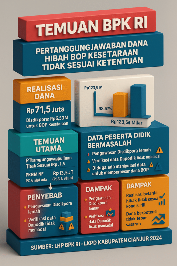 CIANJUR – Badan Pemeriksa Keuangan (BPK) RI Perwakilan Jawa Barat menemukan adanya ketidaksesuaian dalam pertanggungjawaban penggunaan Dana Bantuan Operasional Penyelenggaraan (BOP) Pendidikan Kesetaraan Tahun 2024 di Kabupaten Cianjur. Temuan ini tercatat dalam Laporan Hasil Pemeriksaan atas Laporan Keuangan Pemerintah Daerah (LKPD) Tahun Anggaran 2024.