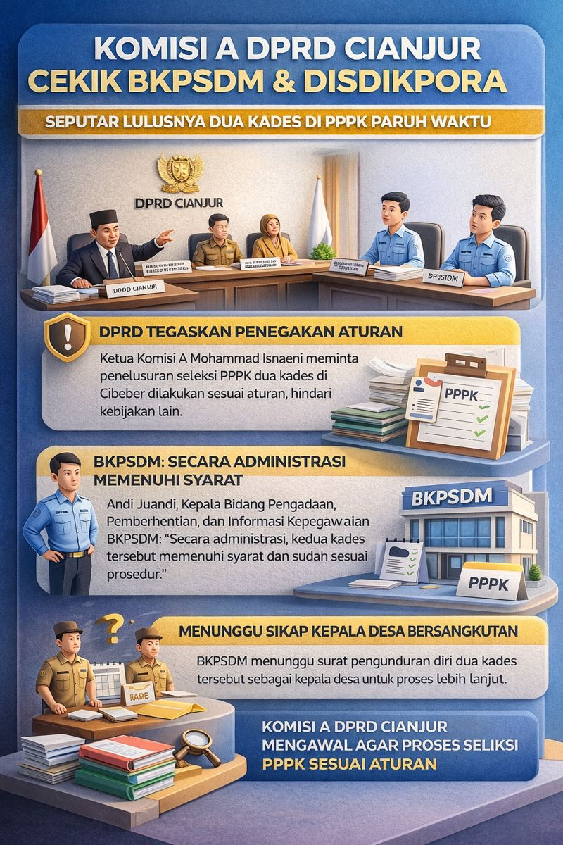 Rapat Dengar Pendapat (RDP) yang digelar di Ruang Rapat Gabungan DPRD Cianjur, Rabu (14/1/2026), berlangsung tegang. Ketua Komisi A DPRD Cianjur, Mohammad Isnaeni, secara tegas mempertanyakan proses seleksi yang memungkinkan dua kades aktif mengikuti dan lolos seleksi aparatur sipil negara tersebut.
