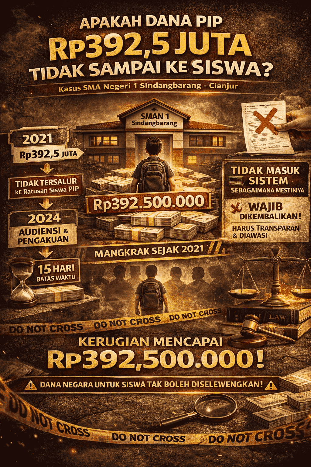 CIANJUR – Forum Peduli Pendidikan (FPP) Kecamatan Sindangbarang, Didi Juandi, mendesak mantan Kepala Sekolah SMA Negeri 1 Sindangbarang, Benny Ahmad Benyamin, agar segera mengembalikan dana aspirasi Program Indonesia Pintar (PIP) tahun 2021 kepada para siswa yang berhak menerima.