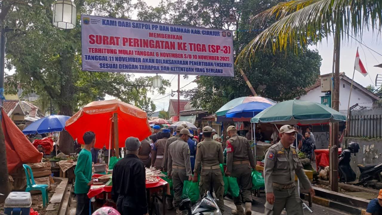 CIANJUR – Pemerintah Kabupaten (Pemkab) Cianjur melalui Satuan Polisi Pamong Praja (Satpol PP) resmi mengeluarkan Surat Peringatan Ketiga (SP3) kepada para pedagang kaki lima (PKL) yang masih bertahan di kawasan Bomero Citywalk, Kamis (6/11/2025).