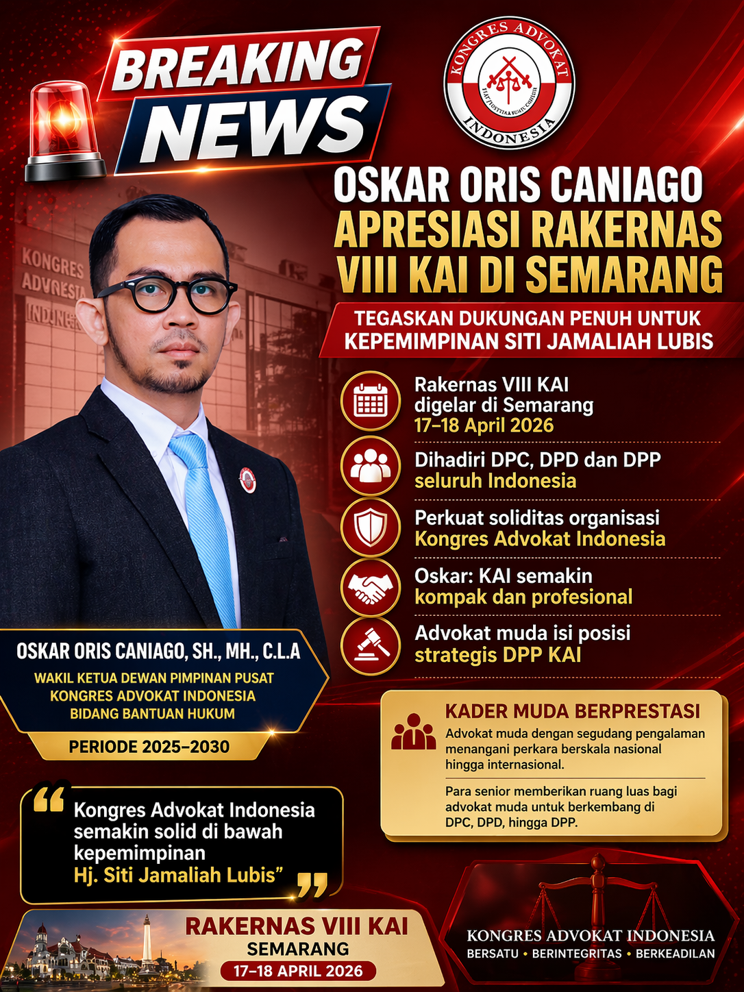 SEMARANG – Oskar Oris Caniago mengapresiasi pelaksanaan Rapat Kerja Nasional (Rakernas) VIII Kongres Advokat Indonesia (KAI) yang digelar di Semarang pada 17–18 April 2026.
