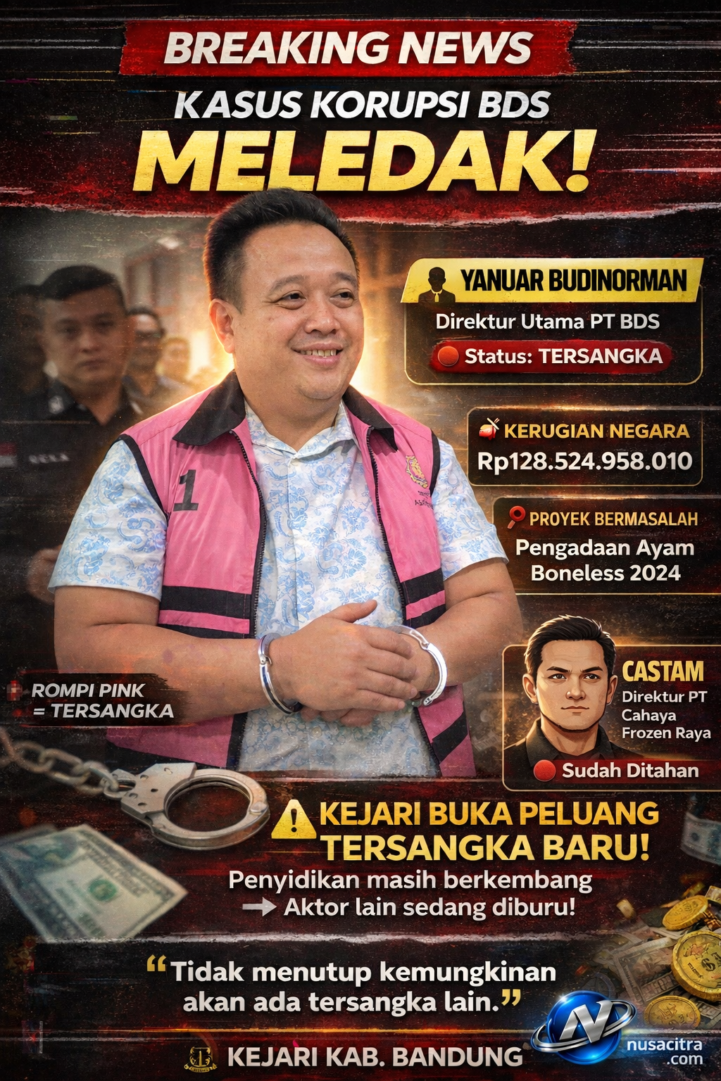 Hingga kini, penyidik telah menetapkan dua nama kunci, Yanuar Budinorman – Direktur Utama PT BDS dan Castam – Direktur PT Cahaya Frozen Raya (CFR)