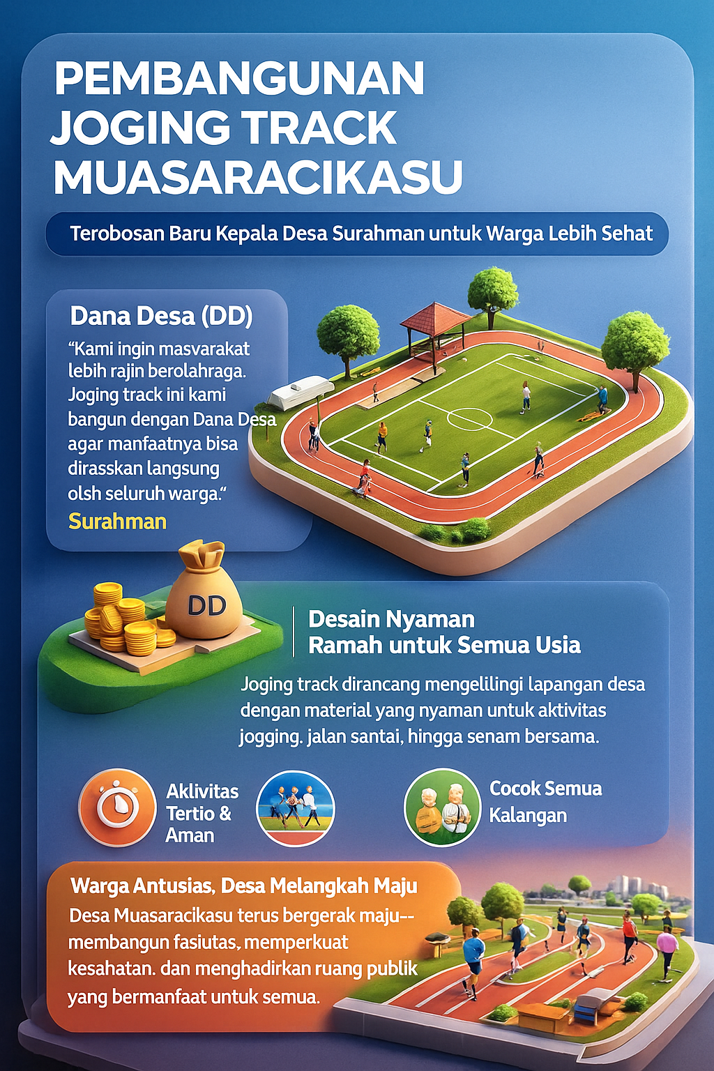 Joging track dirancang mengelilingi lapangan utama desa, memungkinkan warga melakukan jogging, jalan santai, hingga senam bersama dengan lebih tertib dan aman. Bahan yang digunakan pun dipilih untuk memberikan kenyamanan bagi semua kalangan—mulai dari anak-anak, remaja, hingga lansia.